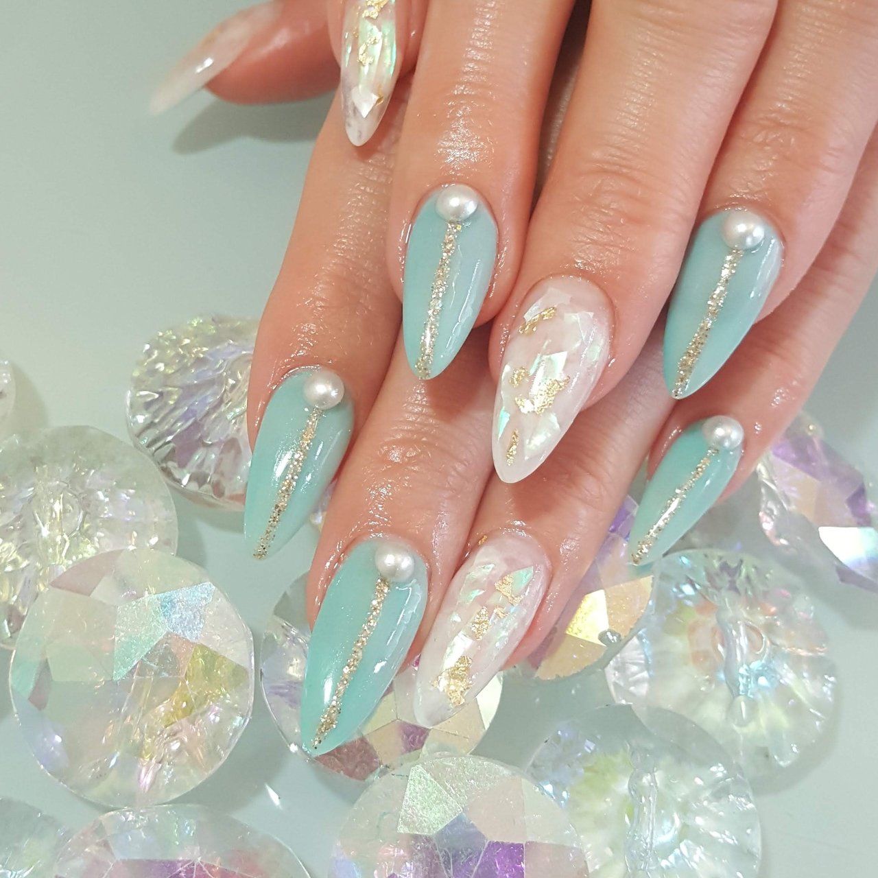 ラメ ワンカラー シェル 水色 ゴールド Nail Nailのネイルデザイン No ネイルブック 水色ネイル ミント ネイル ネイルデザイン